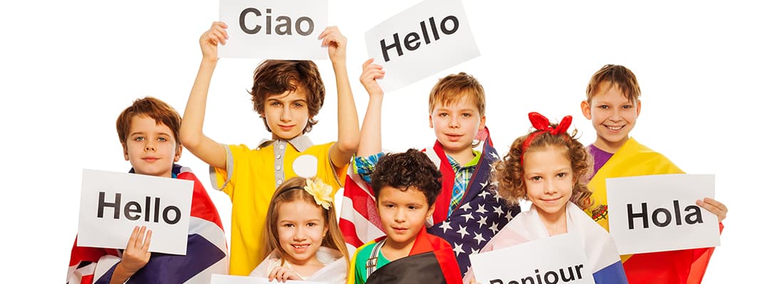 Kids wrapped in flags of USA and European nations, holding greeting signs in different languages, isolated on white